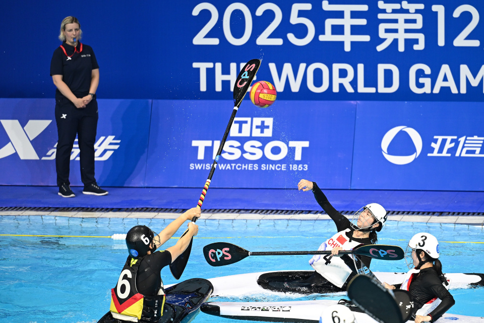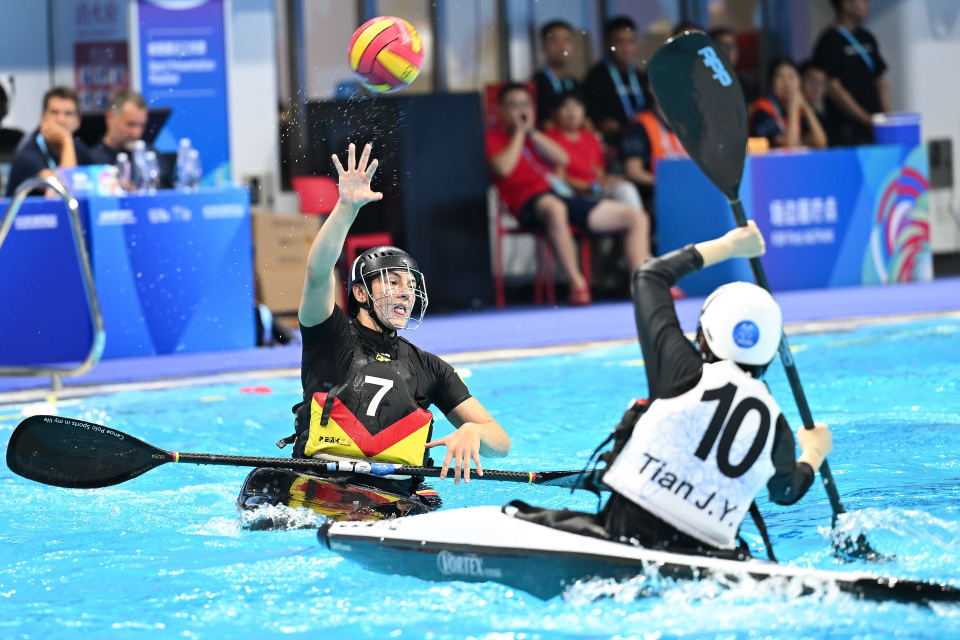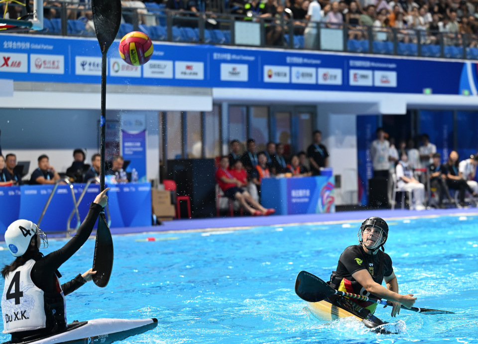 当日,在2025年成都世运会皮艇球女子预赛A组比赛中,中国队不敌德国队。8月13日,德国队球员舍佩尔(前)在比赛中进攻。新华社记者 陈振海 摄